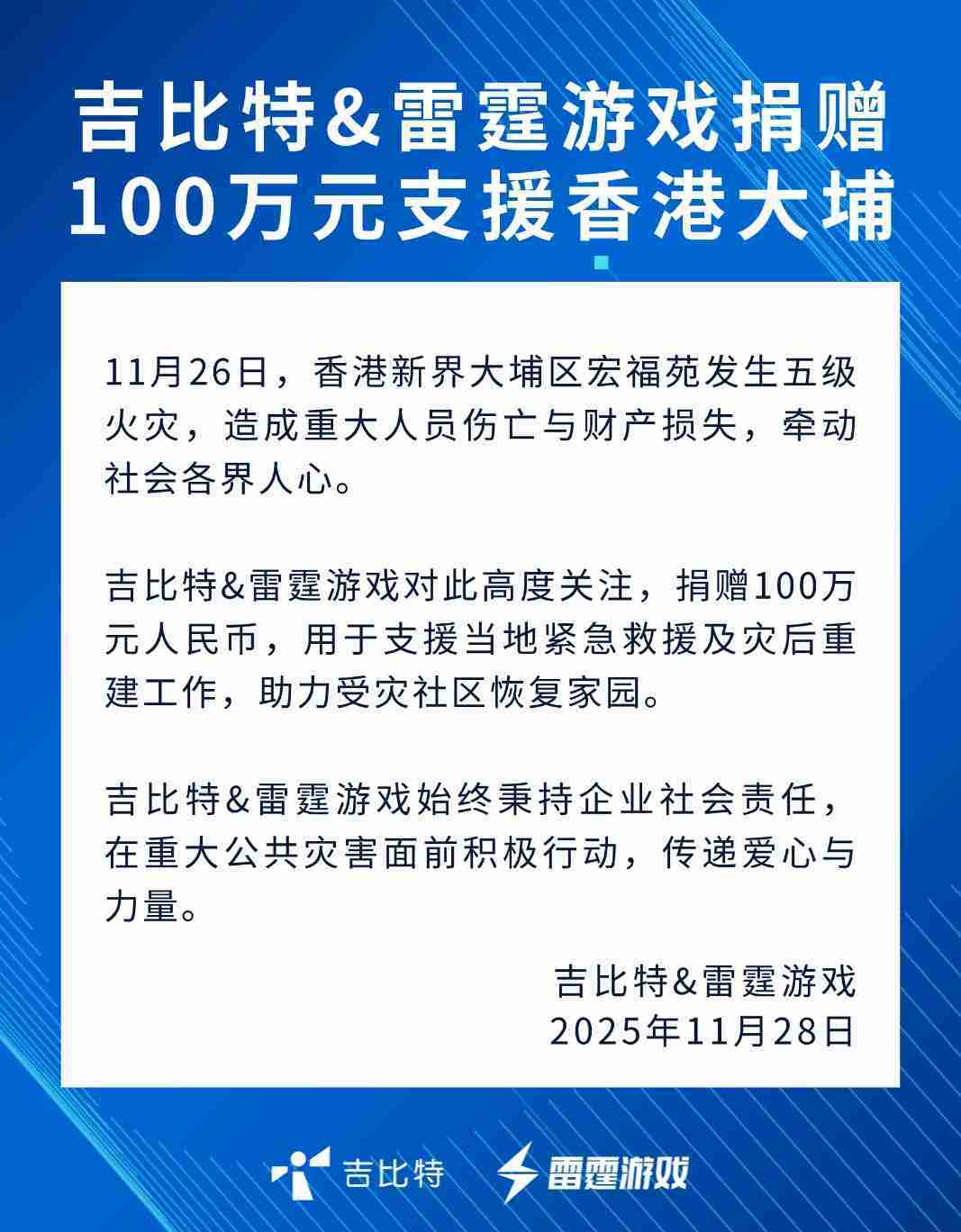 yaxin868&雷霆游戏捐赠100万元 支援香港大埔火灾救援及灾后重建