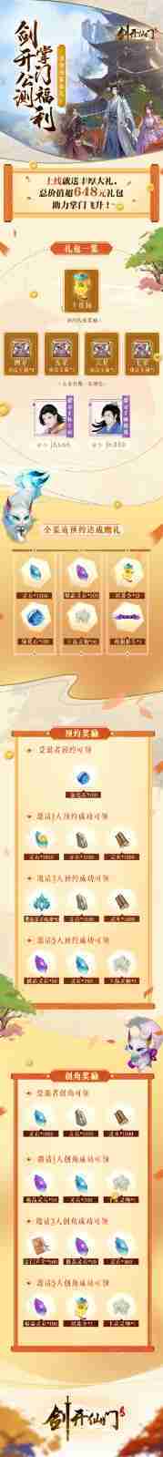 游戏为大家准备了海量的福利,,,,包括上线即可获得的全渠道预约礼包、、十连抽等福利,,,输入密令“JK666”、、、、“JK888”即可领取紫色弟子,,,,达到金丹期后还有功法宝箱可领,,,助力全宗上下实力提升……所有奖励总价值超过648元,,,,而邀请好友一起体验,,,更可以获得额外的奖励哦~